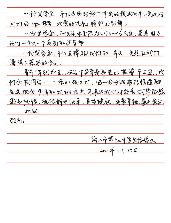 鞍山市第十三中學(xué)受資助學(xué)生的來(lái)信